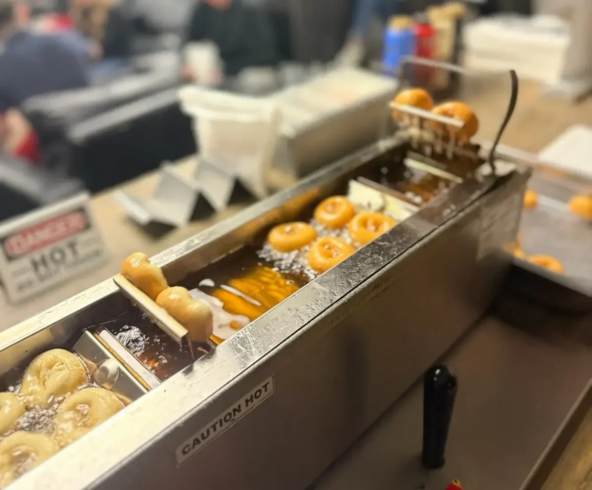 Witness the magic as our state-of-the-art machine crafts each donut, floating them on a river of oil, and flipping them to perfection—all fully automated.