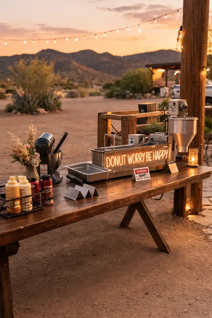 Most dessert catering arrives on a tray. We arrive with a tiny donut factory. Guests watch the donuts cook, smell them frying, and eat them hot. Itโs part dessert, part entertainment.